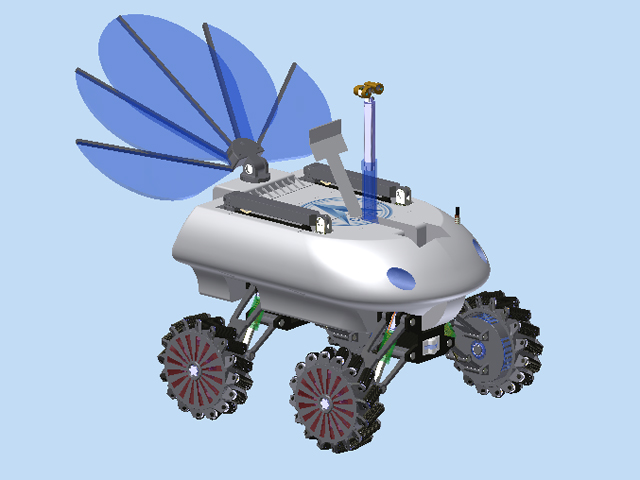 数字化作品“月球车”,以高服役性能、高可靠性为主要设计思想,设计新颖,通过预赛、答辩、现场操作三个比赛环节,获得评委一致认同和好评,夺得本届大赛特等奖。作品“月球车”应用Autodesk Inventor 三维设计软件设计月球车模型,利用运动仿真和应力分析优化模型设计,制作完成了月球车仿真动画。设计中注重使用当今的前沿技术(如永磁直流电机、全向轮、CIGS薄膜电池以及燃料电池等),为未来月球车构建了一个技术框架,目的在于设计出能够满足未来数年内登月计划的月球车。