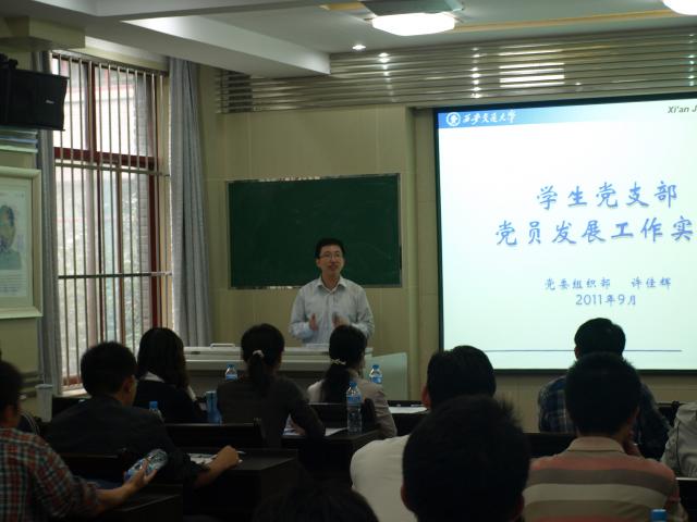 校党委组织部许佳辉老师针对学校的党建工作及如何发展学生党员的相关问题做了简明扼要的介绍,鼓励党支部书记积极发展班上的入党积极分子,为学生入党工作的顺利进行做出贡献。