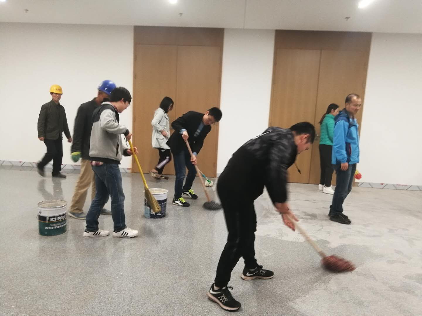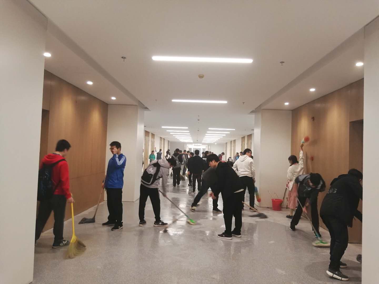 随后,大家前往了高端装备研究院大楼,高端装备研究院作为交大首个进驻创新港的研究院,在这里正式启航。雄伟的建筑、大气的布局,让我们感受了创新港万丈高楼平地起的“交大速度”。对于即将在这里展开的科研生活,大家也是充满了期待。看到刚刚装修完的地面上依然有很多粉尘,党员同志们自发地拿起了扫帚、拖把,积极主动与现场的工人们一起打扫卫生。大家分工合作,默契配合,不一会儿,就将二楼的走廊打扫的干干净净。装备智能诊断与控制研究所学生第三党支部的张鹏同志说:“劳动最光荣,作为共产党员更应该发挥带头作用,为同学们服务,这也是我么对于学校‘劳动教育’号召的实际践行。创新港作为我们的新家园,我们更有义务为创新港出一份力!”