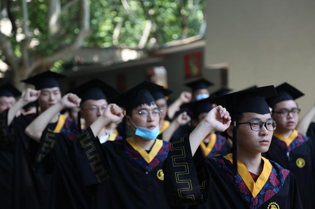 接着,毕业生领誓。文治书院机械63孙逸凡和研究生苏宇同学带领全体毕业生一同喊出誓言“我从交大机械毕业,融入时代建设洪潮,传承西迁精神,担负创新使命,精勤求学,敦笃励志,果毅力行,忠恕任事,饮水思源,知行合一,以梦为马,不负韶华,为世界之光而不懈奋斗!”誓言字字铿锵有力,喊出毕业生们对未来的憧憬和坚定。“以梦为马,不负韶华”,回想当时,你们心怀理想,从五湖四海而来,如今已意气风发,带着梦想奔赴新的远方。