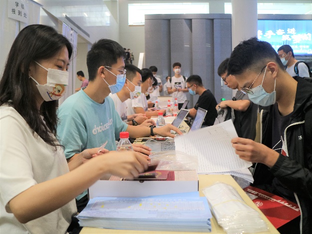领导老师和迎新志愿者们都在期待新生的到来。按照疫情防控要求,在二号巨构大厅内设立报到注册点,通过博士、学术硕士和专业硕士三路办理报到手续,现场分工明确、配合默契,迎新工作井然有序。